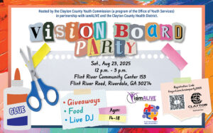 Join us for a Vision Board Party on Sat., Aug. 23, 2025 from 12 pm – 3 pm! Teens ages 14–18 are invited to enjoy giveaways, food, a live DJ, and creative fun at Flint River Community Center, 153 Flint River Rd., Riverdale, GA 30274.